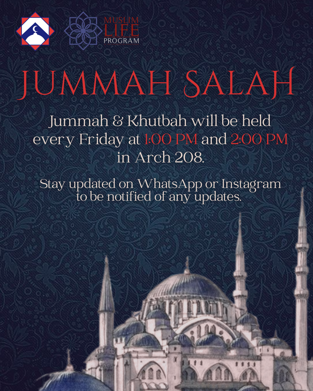 Friday Prayers at ARCH Room 208. Two Jumuahs at 1:10 pm and 2:00 pm. Please check Penn Muslims Whatsapp community regularly for latest updates